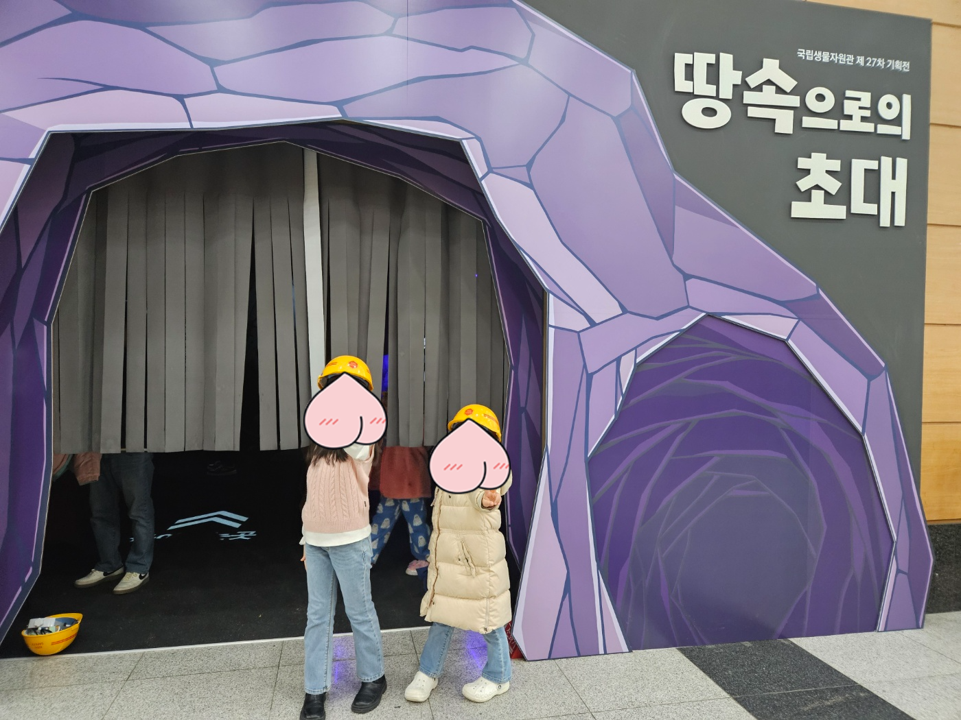 땅속으로 가는 컨셉으로 안전모를 착용 하고 들어가요.